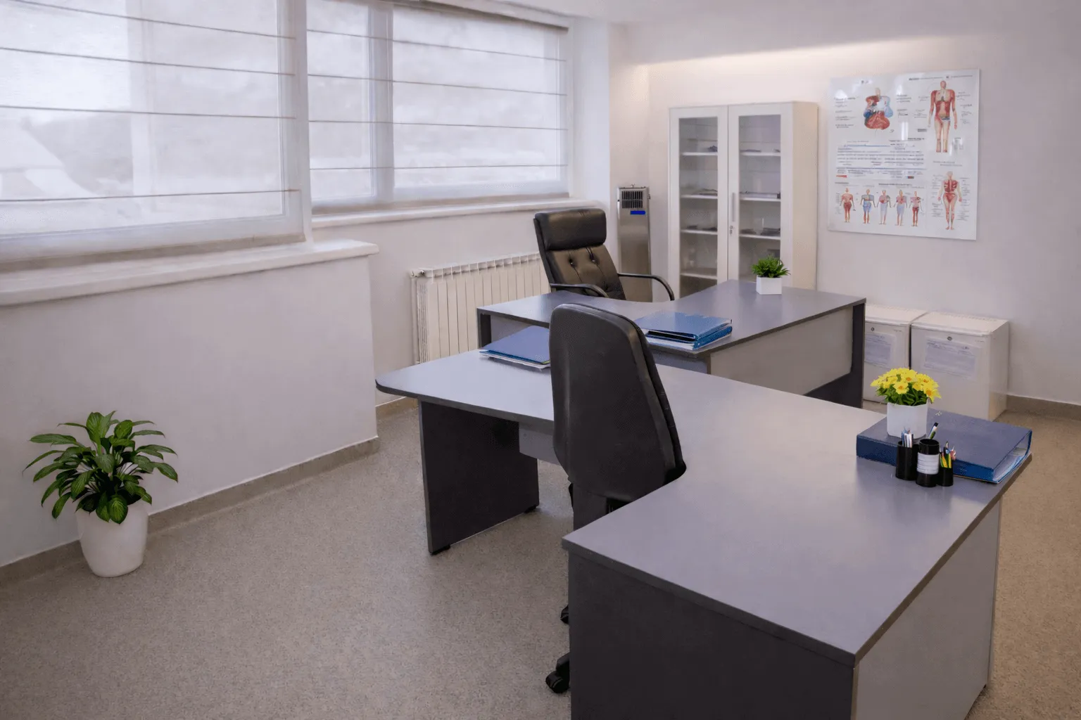 Cabinetul medical funcționează în regim de medical concierge, fiind complet echipat cu aparatură modernă pentru evaluare și monitorizare: EKG, ecograf portabil, echipamente pentru funcții vitale, mobilier medical ergonomic, materiale sanitare de înaltă calitate și dotări pentru situații de urgență. Totul este gândit pentru a oferi siguranță deplină, într-un cadru confortabil și prietenos.